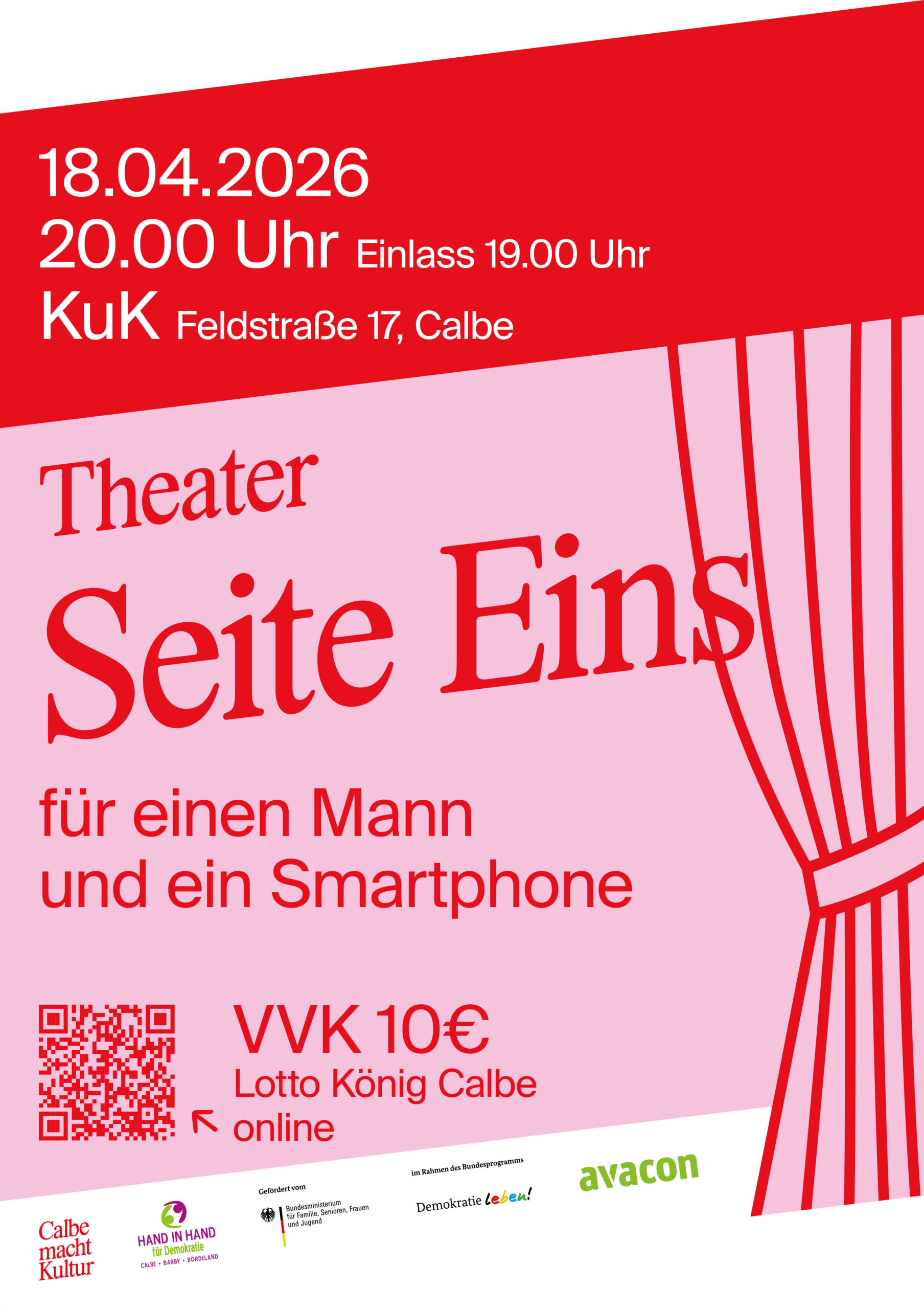 Kunst- und Kulturzentrum Calbe Feldstraße 17, Calbe (Saale)Mit dem Ein-Personen-Stück „Seite Eins“ bringt Schauspieler Jürgen Henne ein [...]